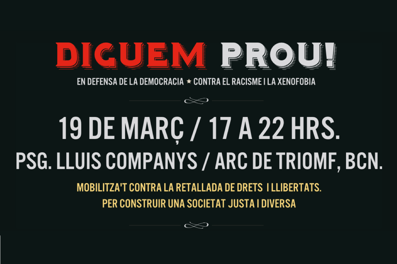 I és per això que SOS Racisme fem una crida el proper 19 de març a tota la ciutadania catalana per manifestar el nostre rebuig a la situació actual; per fer palès que apostem per una societat justa i inclusiva, per la igualtat de drets i d’oportunitats; perquè volem viure i conviure en plena harmonia. En definitiva, per una plena i real democràcia.