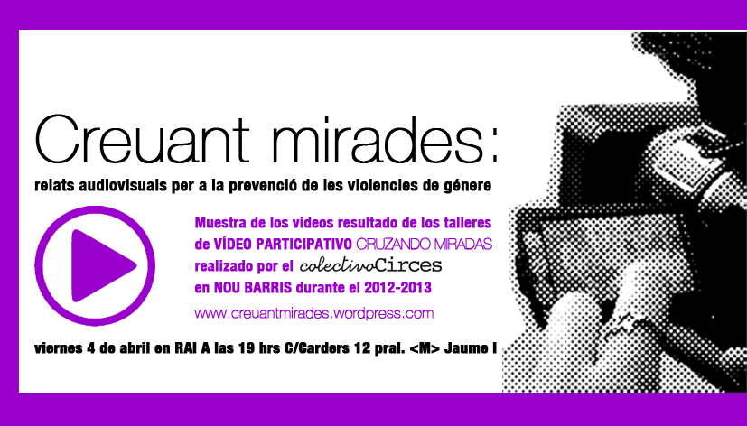 Muestra de los vídeos resultado de los talleres de video participativo Cruzando Miradas, relatos audiovisuales para la prevención de las violencias de género que hemos realizado con el Colectivo Circes en Nou Barris durante el 2012-2013. A la presentación asistirán algunas de las participantes de los talleres y el Colectivo Circes.